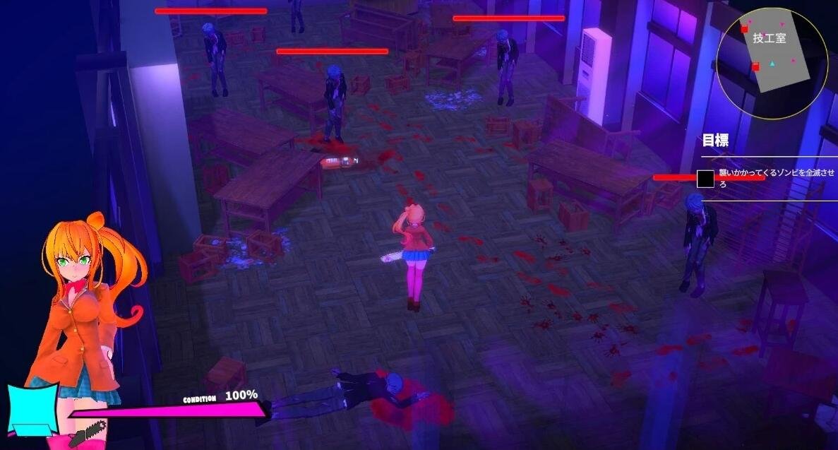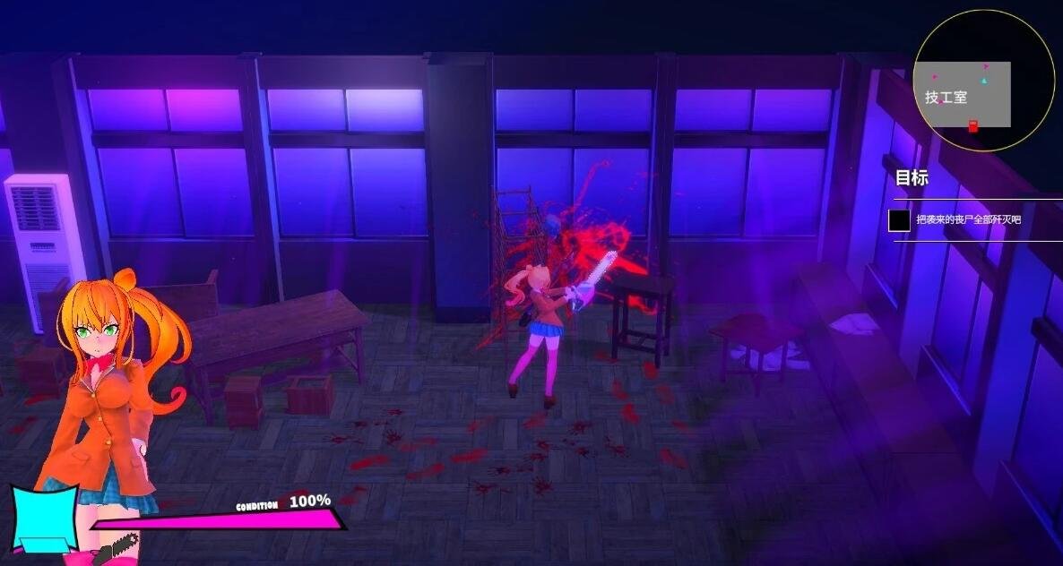 公主手里拿着电锯,在不安全的学校大楼里跑来跑去,那里到处都是怪物。