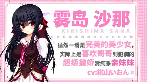 主人公的亲妹妹。清纯可爱,成绩优秀,非常上进的女孩子(就是努力的方向有些迷)。