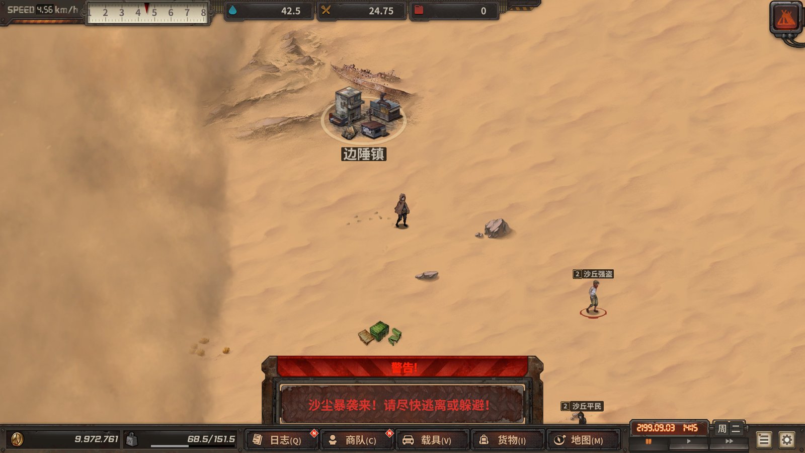 徒步或登上你的载具自由地探索这片残余着辐射的末世废土,直面来自各种变异怪物、土匪强盗、突发事件以及恶劣自然环境的挑战。然而玩家还面临着来自生存的挑战,在地图行进的过程中,饮水、食物、燃油的匮乏都有可能导致你的商队覆灭。