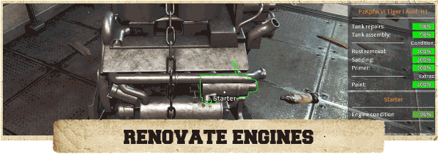 坦克启动,引擎、变速箱、燃油系统一个不能少。将引擎拆下,放上专用维修架,为新的旅程做准备。别忘了,在坦克上路之前加满燃油、冷却液和机油。